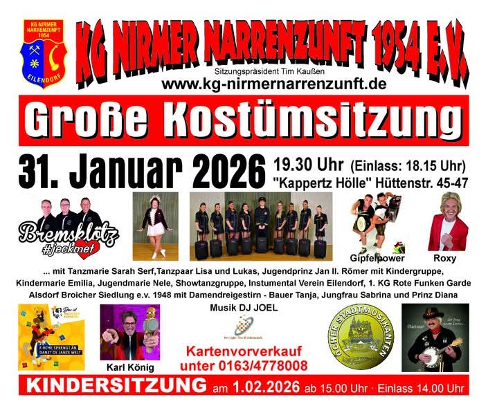 Kindersitzung der K.G. Nirmer Narrenzunft 1954 E.V. Erwachsene 4,- € Kinder 3,- € Einlass : 14.00 Uhr Beginn 15.00 Uhr Sonntag, Februar 1, 2026 15:00 — 17:10 Did you like this? Share it!